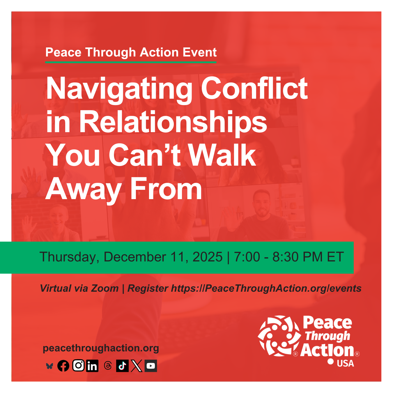 During this 90-minute virtual session, we will explore practical peace skills for navigating conflict in ongoing relationships. Through reflection, guided activities, and small-group conversation, we will consider how communication patterns, emotional responses, and differing perspectives shape conflict. We will practice strategies to de-escalate tense moments, set compassionate boundaries, and listen in ways that strengthen understanding and connection.