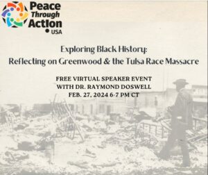 In honor of Black History Month, Peace Through Action USA hosted a free virtual event titled: “Exploring Black History: Reflecting on Greenwood & the Tulsa Race Massacre” where we explored the history and legacy of the Tulsa Race Massacre, one of the worst acts of racial violence and terrorism in American history. Through expert insights from Greenwood Rising, an award-winning, world-class history center and museum, we honored the icons of Black Wall Street, memorialized the victims of the Massacre, and examined the lessons of the past to inspire meaningful, sustainable action in the present. This event explored narratives from Massacre survivors and profiles of historic figures, all contextualized in the history of America. This truth-telling and education for all aimed to repair lingering historical racial trauma–working toward restoration–and charting a new, vibrant, inclusive course for the future. Most importantly, this free virtual learning event supported participants in committing to racial justice and reconciliation and broadened attendees’ understanding of race relations in the United States.