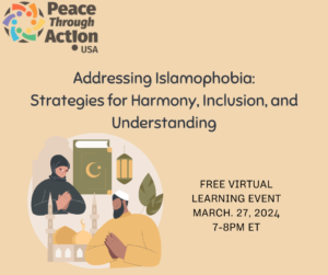 On Wednesday, March 27, 2024, from 7:00 – 8:00 pm ET, Peace Through Action USA hosted an engaging free virtual learning event titled, “Addressing Islamophobia: Strategies for Harmony, Inclusion, and Understanding.” In this session, we explored the complexities of Islamophobia, with an emphasis on dismantling stereotypes and cultivating empathy. Through interactive discussions and activities, we analyzed the root causes of Islamophobia and equipped participants with practical strategies for challenging discriminatory attitudes and behaviors. By surveying diverse perspectives and experiences, this event illuminated paths towards more compassionate and cohesive communities. Using a variety of peacebuilding skills and nonviolent approaches, this free virtual learning event deconstructed barriers, promoted social understanding, and empowered participants with actionable strategies for intercultural education and exchange.